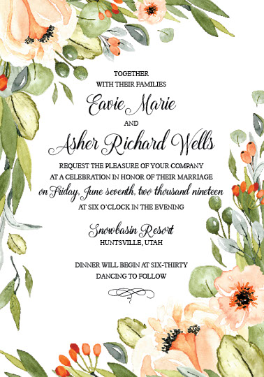 This invitation measures 5 x 7 inches and prints on a white or cream standard 100# cover. The price includes single envelopes (white or cream) with an option to add a custom lining to the envelope. The return address price includes black flat ink. Envelope Liners assembled by customer.